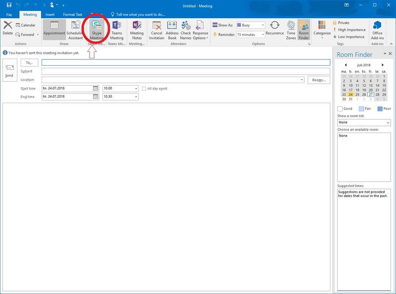 3. I det nye møteinnkallingsvinduet som dukker opp, klikker man på "Skype-meeting" knappen.