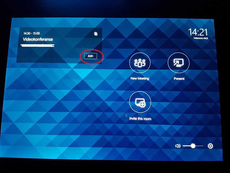 10. Møt opp på rommet på tildelt tid. Rommet har nå fått en Logitech touch-skjerm (se bilde) som brukes for å sette i gang skype-møter. Trykk på "join" knappen på touch-skjermen for å starte videomøte.