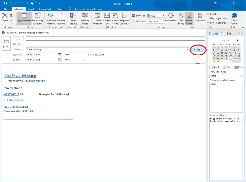 For å bestille Skype-videorommet, enten på Sydnesplass 12/13 eller på Stein Rokkans Hus, bruker en Outlook