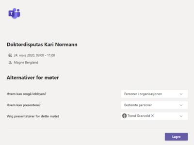 - "Hvem kan omgå lobbyen?". Hvis du velger "Alle" her, kan hvem som helst komme inn i møtet. Hvis du velger andre alternativer, må en av de som deltar i møtet "slippe inn" eventuelle eksterne deltakere. (Dette må man eventuelt passe på under møtet.)