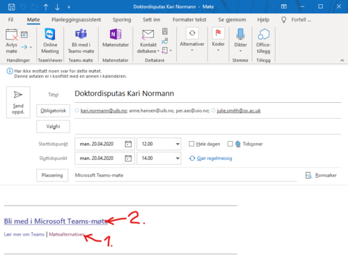 I innkallingen kommer det automatisk en lenke til møtet (merket med 2 på bildet under). Deltakerne klikker på den for å delta i møtet med Teams-programmet (hvis de har det installert) eller en vanlig nettleser.