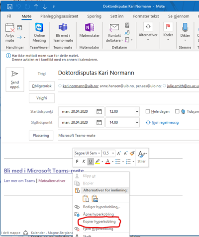 - Høyreklikk på teksten "Bli med i Microsoft Teams-møte" og velg "Kopier hyperkobling". Da får du tatt en kopi av lenken som må brukes for å delta i møtet.