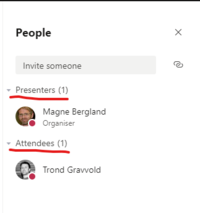- Du velger også hvem som skal kunne presentere på møtet. De du velger her får rollen "Presenter". Men denne følger også noen andre rettigheter, bl.a. til å kaste ut andre møtedeltaker og dempe mikrofonene deres. (Se detaljert beskrivelse av rollenes rettigheter.) Det kan derfor være lurt å begrense mengden deltakere som skal presentere.
