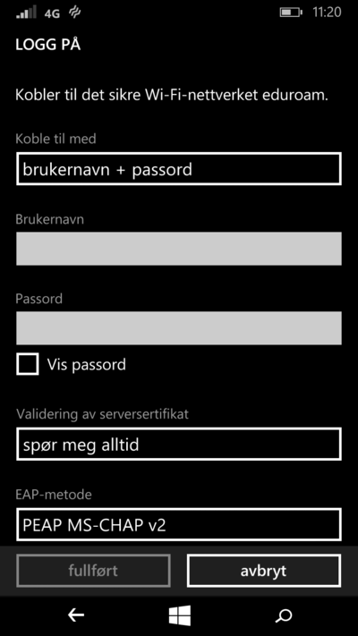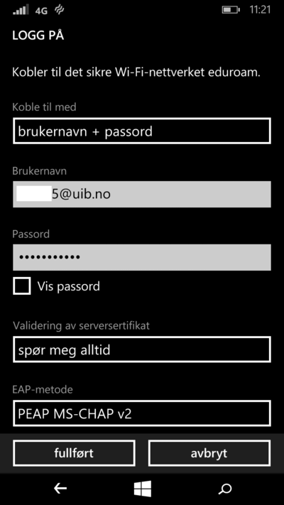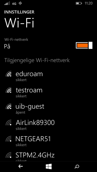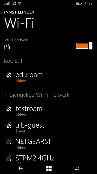 Denne guiden viser deg hvordan du kobler deg til det trådløse nettverket eduroam på Windows Phone 8.1. Nettverket er tilgjengelig stort sett over hele UiBs område. Les mer om Eduroam.