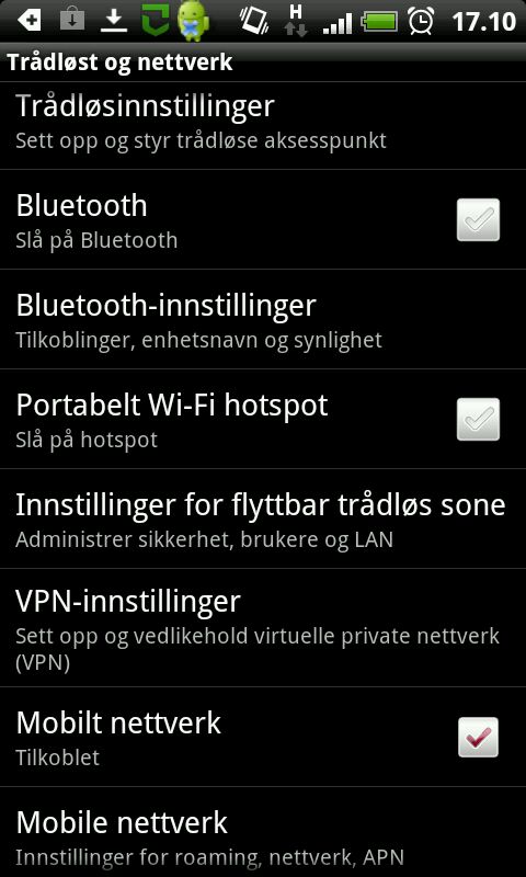 HTC Android 2.3.5: Innstillinger for trådløst og nettverk.