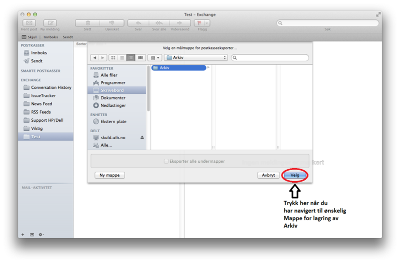Du vil da bli bedt om å velge målmappe for hvor du ønsker å arkivere dine eposter, i eksempelet under har jeg valgt skrivebord og mappen Arkiv som målmappe.
