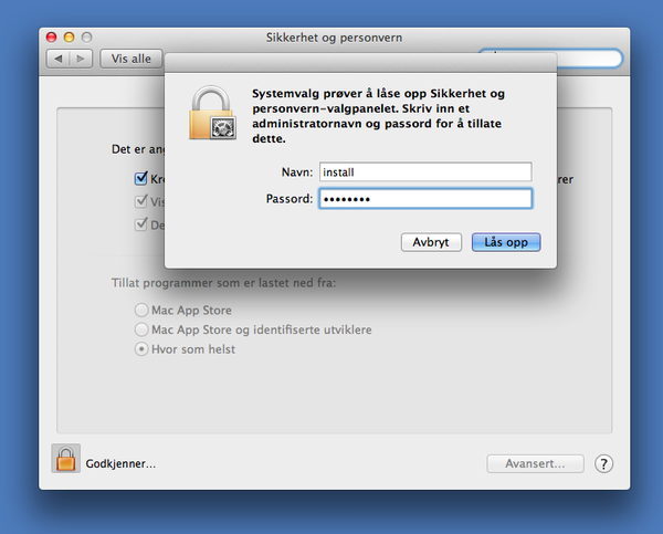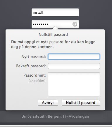 For at du skal få full tilgang til alle innstillinger på din Mac-klient har vi lagt inn en konto med administratorrettigheter. Vi kaller denne kontoen for install-kontoen.
