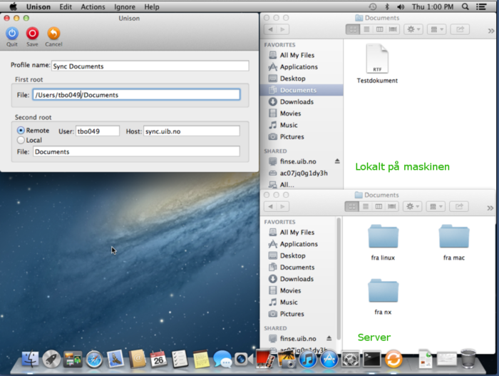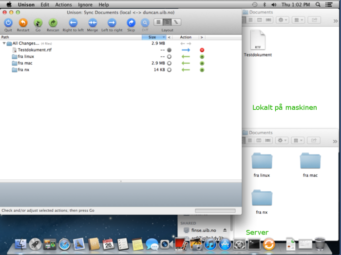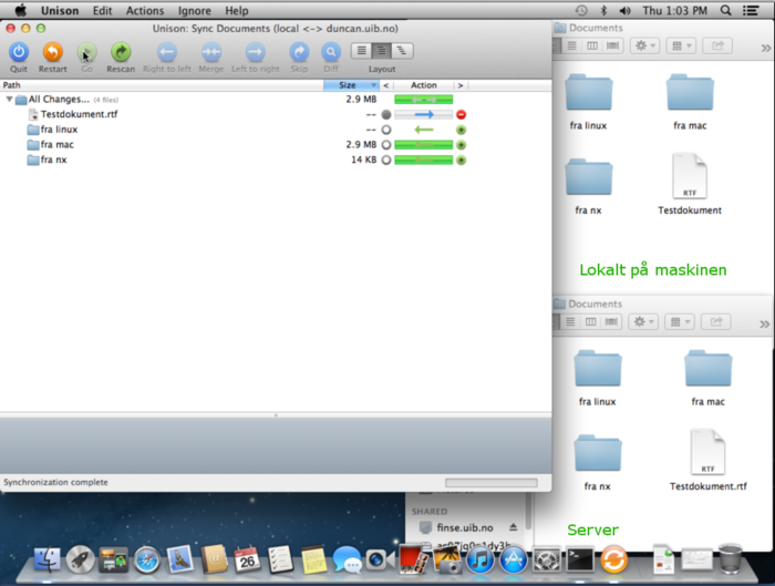 I punkt 4 er det potensiale for å slette filer. Unison er et synkroniseringsverktøy. Om en fil befinner seg lokalt, men mangler på server vil en "Right to left" slette filen også lokalt slik at begge kopiene er identiske!