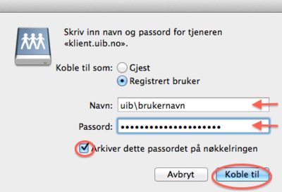 - Du autentiserer deg med tilhørighet/domene slik: uib\BRUKERNAVN, ditt UiB-brukernavn og ditt UiB-passord.