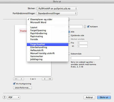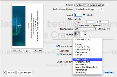 Der hvor det står valgt "Eksemplarer og sider" velger en "Farge/kvalitet"