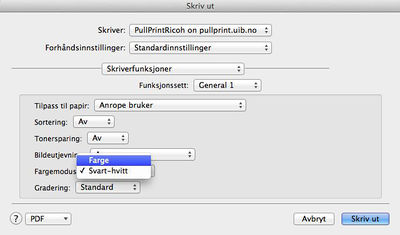 Svart hvit er standard for utskrift dersom en ikke velger noe.