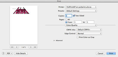 For få frem printmenyen kan en blant annet trykke "cmd" + "P". I noen tilfeller må en trykke "Vis detaljer" dersom det allerede ikke er valgt.