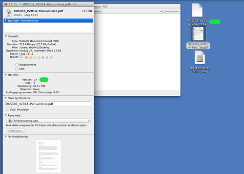 8: Høyreklikk / ALT + klikk og "Vis info" på PDF filen vil nå vise at versjonen er oppdatert til 1.4.