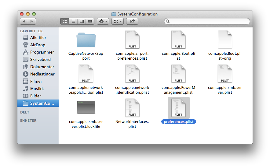 Først og fremst er det nødvendig å lokalisere følgende mappe: "/Library/Preferences/SystemConfiguration/"