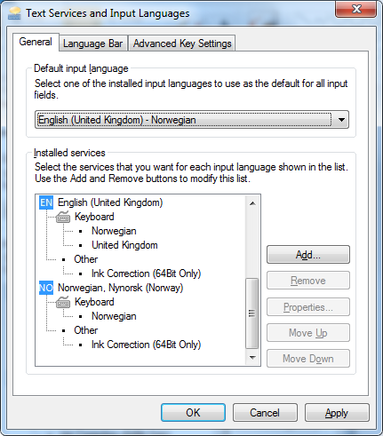 - Velg 'English (United Kingdom) - Norwegian' i gruppen 'Default input language'