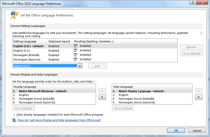 Office 2010 insisterer på å velge stavekontroll og synonymordbok ut fra hvilket språk som er valgt som inndataspråk for Windows 7. Dette kan være litt plagsomt dersom man ønsker å skrive engelske dokumenter med norsk tastatur. Særlig plagsomt er det at synonymordboken nekter å virke ordentlig for andre språk enn det aktive inndataspråket. Man kan gjøre ett oppslag i synonymordboken, men man kan ikke bla frem og tilbake i synonymstrukturen.