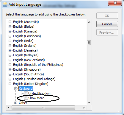 - Velg 'Show more...' i underguppen 'Keyboard'