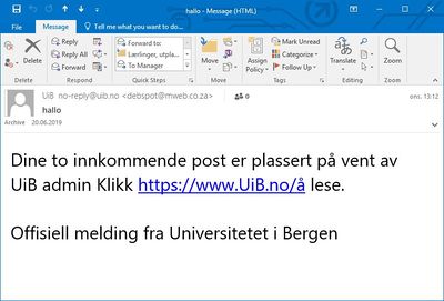 De fleste ansatte på UiB fikk en e-post med lenke til en nettside der man skulle oppgi brukernavn og passord, angivelig for å motta "innkommende post plassert på vent":