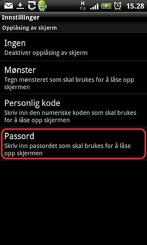 - Vi anbefaler at skjermen låses med "Passord". Et passord på ti tegn er veldig mye sikrere enn bare firesifret PIN eller mønster med inntil ni unike punkter.