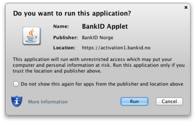 Trykk så på "run" i vinduet som spør om "Do you want to run this application".