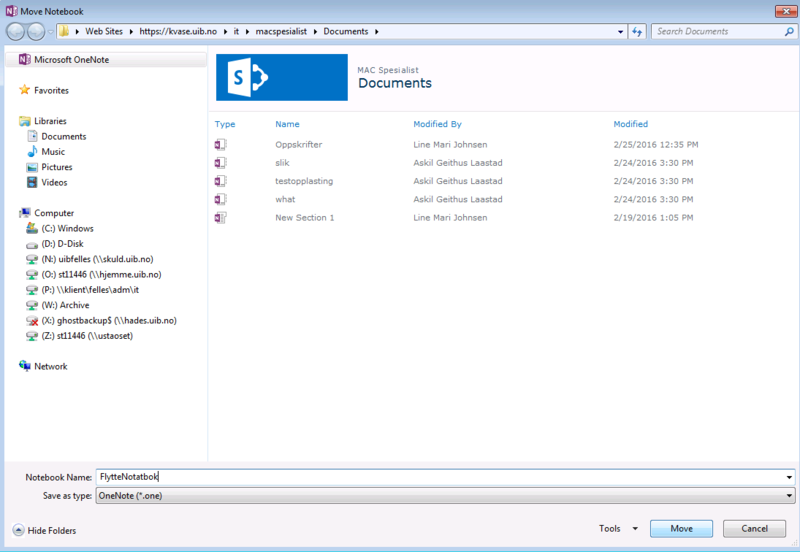 Standard lagringsted for nye notatblokker, ved bruk av OneNote på en Windows-klient fra UiB, er en mappe på hjemmeområdet kalt OneNote Notebooks. Denne veiledningen viser hvordan du flytter en notatblokk, som er lagret i denne mappen, til en SharePoint site. ________________________________________________________________________________________________________________________________________________________________________________________________________________