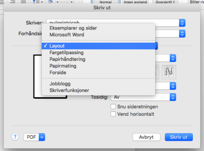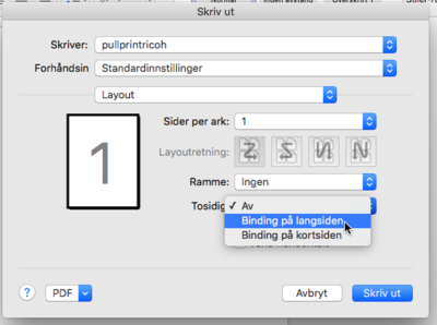 Om man vil ha tosidig utskrift i tillegg, velger man Layout i den samme rullegardinen...