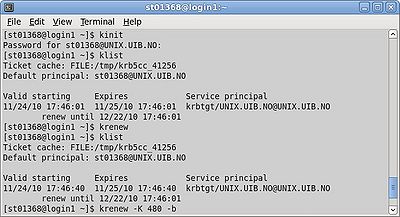 Denne vil be om passord og be om en ny ticket fra kerberostjenesten, denne vil da få nye 24 timers levetid og kan fornyes innenfor 4 uker. Se over for hvordan du finner gjenværende levetid på ticket.
