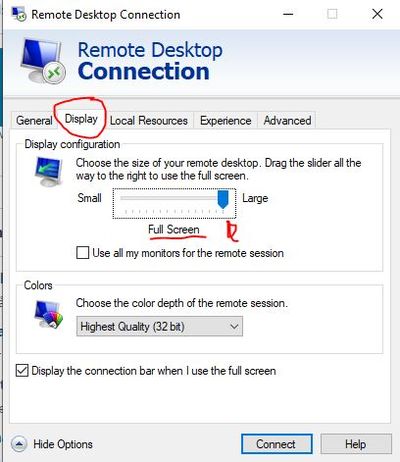 Under arkfanen "Display" kan det være lurt å velge "Full screen" (skyv mørkør helt til høyre) så slipper du å bruke scrollbar for å se hele skjermen.