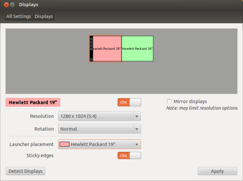 Merk at Ubuntu i de fleste tilfeller vil automatisk detektere at du setter inn / tar ut en skjerm.