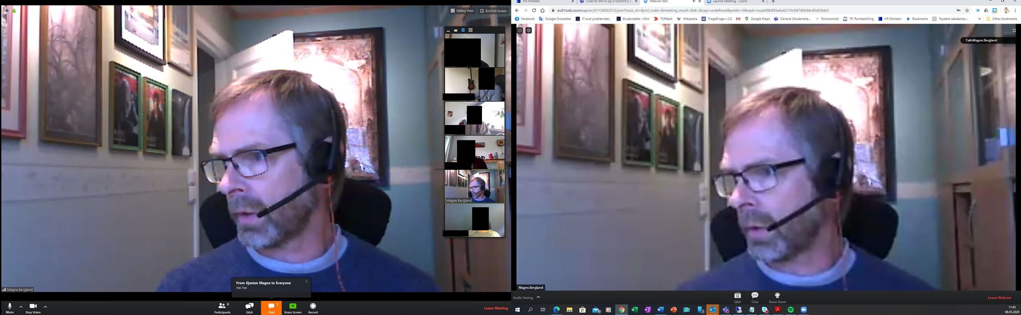 Til slutt kan en se et eksempel på forskjell på skjermbildet for co-host til venstre og atendee til høyre: