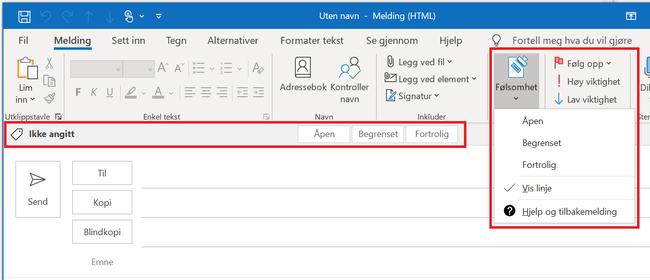 I Office vil du se merkelappene under "Følsomhet" når du skriver et dokument eller en epost: