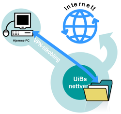 VPN (Virtual Private Network) innebærer at du setter opp en direkte, lukket forbindelse fra din PC til UiBs nettverk. PCen din blir da "innlemmet" i UiB-nettet. Når du bruker nettjenester gjør du det som om du arbeider fra en maskin i UiBs nettverk.