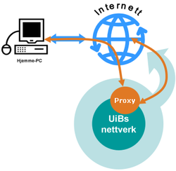 Bibliotekets hjemmeside vil automatisk benytte proxy-server når det er nødvendig for tilgang utenfor UiBs nett. Når du får spørsmål om pålogging til proxy-server, bruk ditt vanlige brukernavn og passord ved UiB.