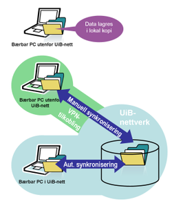 Standardoppsettet for bærbare PC-er ved UiB inkluderer "offline files" eller "synkronisering av hjemmeområde". | Standardoppsettet for bærbare PC-er ved UiB inkluderer "offline files" eller "synkronisering av hjemmeområde". | ||