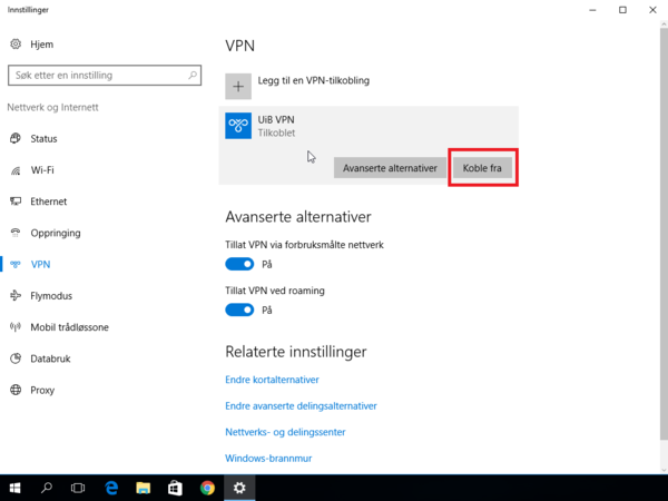 For å koble fra, klikker du på "Koble fra". Du må gjerne finne frem VPN-koblingen, ved å klikke på Nettverksinnstillinger, som vist i steg 1.