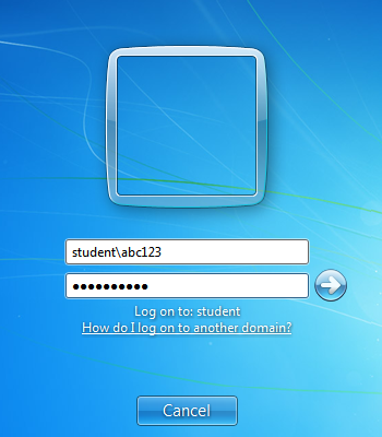 Dersom det gjelder innlogging med brukeren 'install' på bærbare eller unmanaged-maskiner må 'log on to' være satt til: MASKINNAVN (this computer) på maskiner med Windows XP. På maskiner med Windows 7 har du to alternativer. Det første alternativet (som du kan se på bildet under) er at du kan skrive inn MASKINNAVN\install (eks: TEST009191\install).