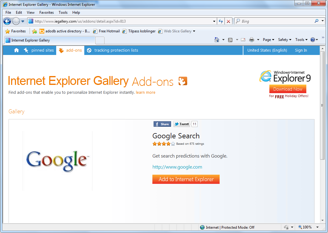 Hvis du ikke vil bruke Bing som standard søkemotor for Windows Internet Explorer kan du velge en annen. Problemet for oss er at det ikke virker helt som det skal, siden vi er i Norge. Den største samlingen søkemotorer finner man ved å gå til galleriet for USA, ved å åpne denne siden i Internet Explorer. Du kan bruke søkefeltet på siden for å finne din favoritt.