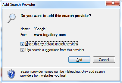 - Merk av for 'Make this my default search provider', og velg knappen 'Add'