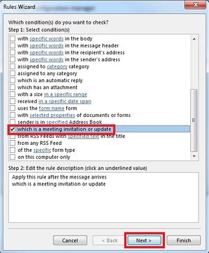 I Rules Wizard blar du ned til du finn valget “Which is a meeting invitation or update”. Velg denne og klikk Next.