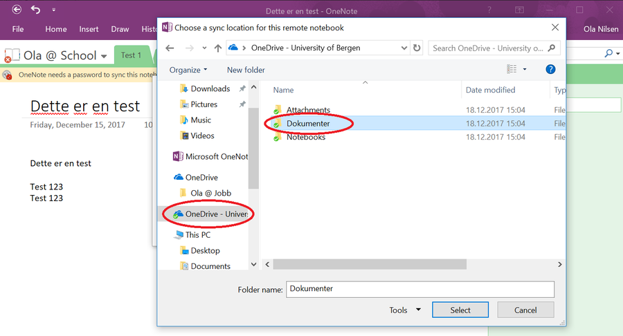 Gå inn på "OneDrive - University of Bergen" og definer en ønsket plassering for OneNote - dokumentet