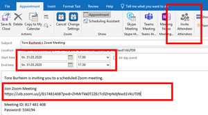- Hvis du vil invitere en større gruppe inn i møtet, trenger du ikke å invitere hver og en. Du kan sende dem delingslenken som du finner i møteinnkallingen, enten fra Zoom eller fra Outlook. ("Join URL" i bildet over.)
