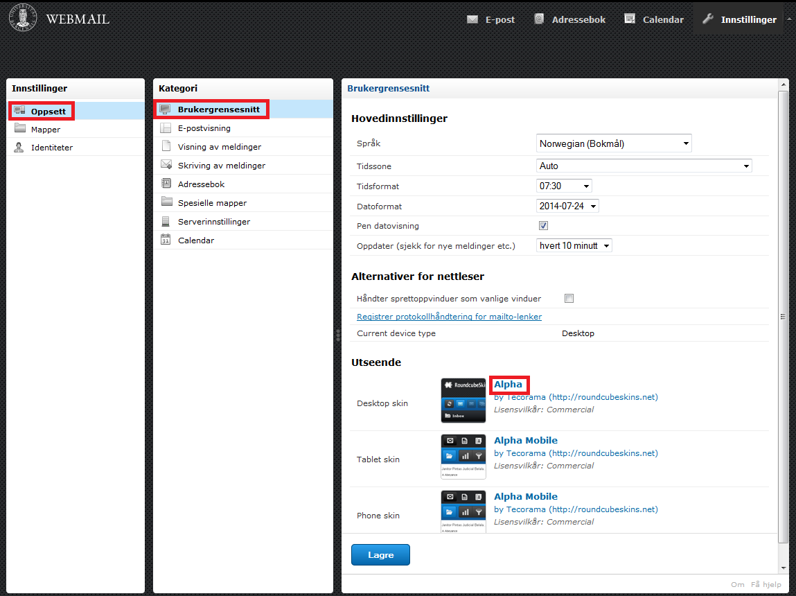 For å endre brukergrensesnitt trykker du på «innstillinger» og velger «brukergrensesnitt» under «oppsett». Under «utseende» endrer du skin/bunad for henholdsvis desktop (stasjonær/bærbar PC), tablet (iPad etc) og mobiltelefon.