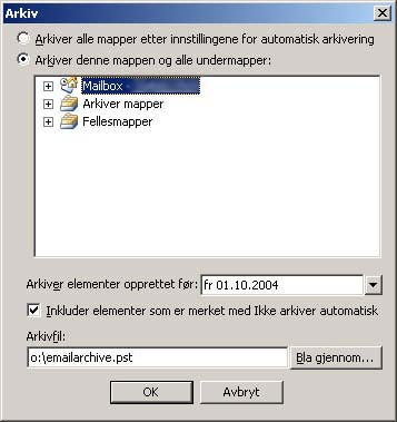 b) Man kan velge hele Mailbox eller en enkelt mappe. En mappe kan ha undermapper, som også vil bli arkivert.