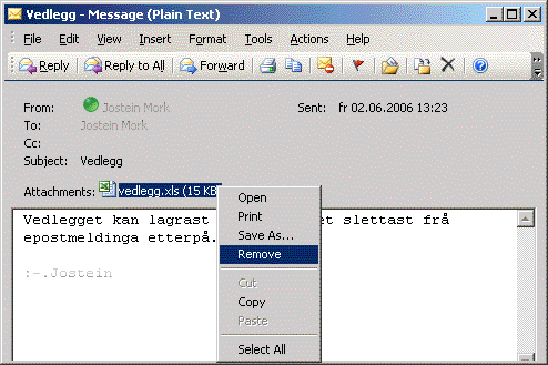Hvis en ønsker å ta vare på vedlegget kan en lagre det med å velge Lagre som før en fjerner vedlegget.