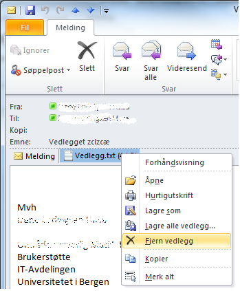 Hvis en ønsker å ta vare på vedlegget kan en lagre det med å velge Lagre som før en fjerner vedlegget. 1) Åpne eposten og høyre klikk på vedlegget og velg Fjern vedlegg