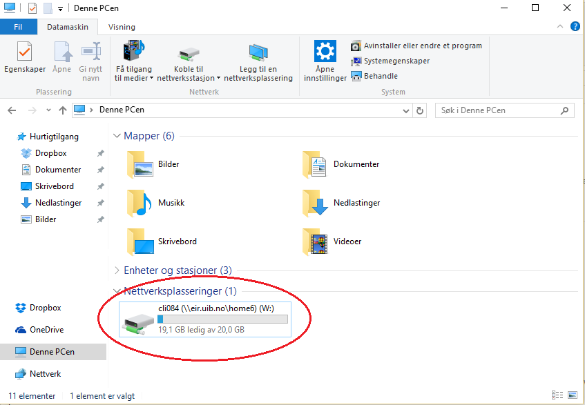 NB! For å koble til hjemmeområde eller fellesområder på UiBs servere må du være Pålogget med VPN
