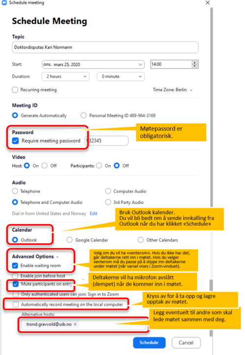 - Kall inn til et Zoom-møte fra Zoom-programmet eller fra Outlook kalender. (Hvis det er undervisning i et undervisningsemne, skal du kalle inn til et videoseminar i Mitt UiB.)