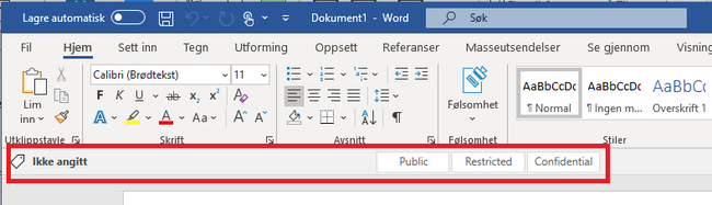 Åpne dokumenter og eposter vil ikke ha noe merking, men de dokumentene som har merking vil få følgende merking nederst til venstre på hver side: